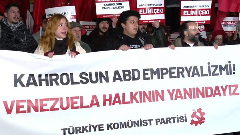 ABD Büyükelçiliği önünde toplanan TKP’liler, ABD’nin Venezuela’ya yönelik hücumlarını protesto ederek, “Bugün savaş bir müdahaleyle öbür bir noktaya gelmedi; bugün yeni bir safhaya taşındı. Kederleri uyuşturucu falan değildir. Uyuşturucu arıyorlarsa, kendi önderlerine bakacaklar. Bu savaşta Venezuela halkı yalnız değildir” açıklamasını yaptı.